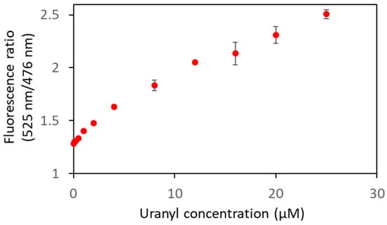 Fluorescence ratios (F525nm/F476nm) as a function of the concentration of uranyl. Measurements were performed with 1 µM of biosensor in 50 mM HEPES pH 7 with an excitation wavelength of 440 nm. The averages of the fluorescence ratios resulted from three independent experiments.