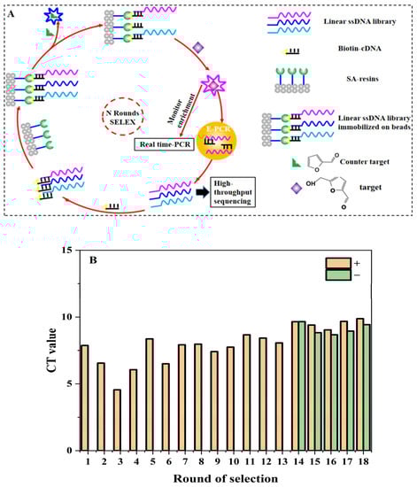 SELEX for 5-HMF aptamers: (A) SELEX procedure. (B) Selection progress tracking via Q-PCR.