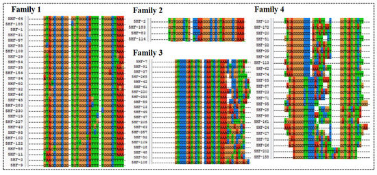 The high-throughput sequencing technology was used to sequence the enriched library of the 9th, 13th, 16th, and 18th rounds. The top 300 sequences of the high-frequency sequences were selected to analyze their homology rate for the 30 bp random sequences using ClustalX2 software. The results are shown in Figure 2, and the high homologous sequences belong to four families. Then, we selected five aptamers (5HF-1 as H1, 5HF-2 as H2, 5HF-3 as H3, 5HF-7 as H7, and 5HF-10 as H10) to cut their partially fixed area (12 nt and 10 nt were removed from the 5′ and 3′ constant regions of the aptamers), and the detailed sequences information is shown in Table 1. The secondary structures of the tailored aptamers were predicted using DNAMAN software. The results (Figure 3A) showed that these aptamers contained one to three ring structures, which were selected to identify binding activity.