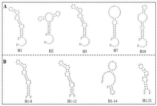 Secondary structures: (A) secondary structures of the five selected aptamers. (B) Secondary structures of the truncated H1 aptamer.