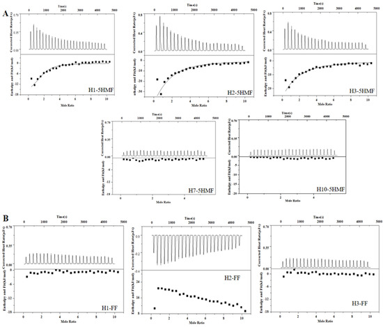 ITC analysis affinity between aptamers and 5-HMF, FF. (A) ITC analysis affinity between aptamers and 5-HMF. (B) ITC analysis affinity between aptamers and FF.