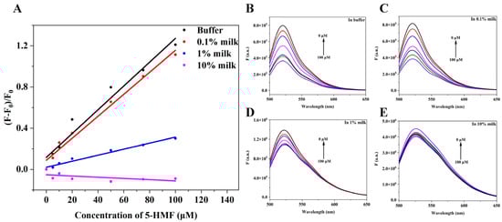 Matrix interference analysis. (A) The relationship between change of fluorescence intensity and concentration of 5-HMF in different matrix. (B) The fluorescence spectra of the quenching sensor in buffer. (C) The fluorescence spectra of the quenching sensor in 0.1% milk matrix. (D) The fluorescence spectra of quenching biosensor in 1% milk matrix. (E) The fluorescence spectra of the quenching sensor in 10% milk matrix.