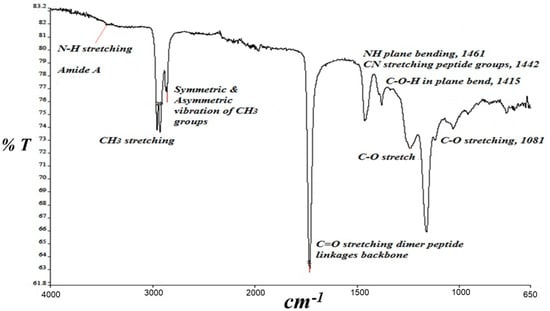 Using FT-IR spectroscopy, we observed the presence of the amide I band (an overlapping spectrum of α-helices, β-sheets, turns, and random coils, which form the basic structure of the protein) [36] (Figure 2) at 1650 cm−1 and 1715 cm−1 caused by C=O stretching vibrations, which identified the C=O stretching vibrations of the peptide linkages in the GOX backbone at 1600 cm−1 to 1700 cm−1 and 1650 cm−1 to 1750 cm−1 [29,37]. Furthermore, the amide band II peak at 1462 cm−1 was observed due to the combination of N-H in-plane bending and C-N stretching linkages for the peptide groups [37,38,39]. There was another small band, amide band III, at 1239 cm−1, which correlates well with the Delfino data, 2013 [40]. In addition, we found two wide bands in the region 3400 to 2900 cm−1, representing the amide A and bond linkages to -CH3 stretching at 3400 cm−1 and 2958 cm−1, respectively [25]. Therefore, the FT-IR spectra indicate the successful immobilization of GOX on the PA-PPE surface.