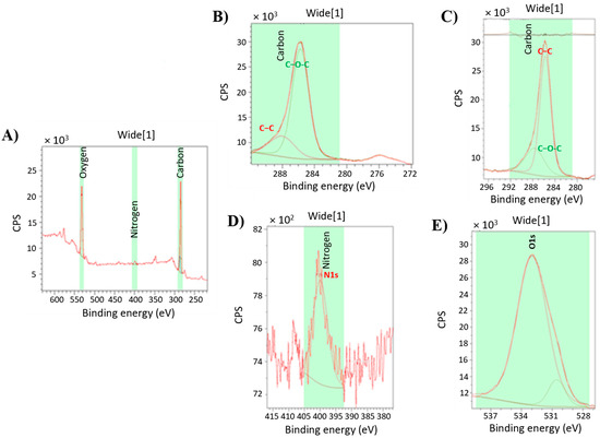XPS for GOX (A) found C(1s) (B,C), N(1s) (D), and O(1s) (E) spectra.