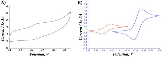 After immobilizing GOX onto the PA-PPE, the electrochemical characterization was performed in 0.01 M PBS under N2. The CV profile for PA-PPE-GOX exhibited a pair of well-defined and nearly symmetric redox peaks with a formal potential of −0.44 V (see Figure 4A) close to the standard electrode potential of GOX [48], which was similar to previous reports [23]. In addition, we compared the CV responses for PPE-PA-GOX at the scan rate of 0.050 V/s between 5 mM potassium ferricyanide, an anionic probe (left), and 5 mM ruthenium-hexamine chloride 5 mM, which exhibited a cationic probe graphics (Figure 4B, right). Two different probes toward the same electrode explained the electron transfer involved and the interaction between the electrodes (negative charge) and the electrostatic interaction between the electrode and probe molecules (specific potential for oxidation and reduction).