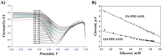 Additionally, the electrocatalytic activity of the PA-PPE-GOX toward glucose was studied by conducting SWV experiments with different concentrations of glucose ranging from 0.2 mM to 0.84 mM in 0.1 M PBS solution under N2. The successive addition of glucose resulted in a gradual decrease in the reduction current (Figure 6A), which was linearly proportional to the increased concentration of glucose. This trend can be explained by the fact that the addition of glucose triggers the enzyme-catalyzed reaction between GOX and glucose by the formation of FADH2 from FAD, resulting in a subsequent decrease in the cathodic peak current [24,57]. This reaction causes a decrease in the amount of oxidized GOX on the PA-PPE electrode and reduces the electrode reduction current. To demonstrate the increased sensitivity of the newly developed electrode, PA-PPE-GOX, toward glucose detection, we compared its response with the current response developed for GOX immobilized on graphene oxide through the EDC/NHS cross-coupling method, GO-PPE-GOX. As can be seen from the calibration plots of PA-PPE-GOX and GO-PPE-GOX (Figure 6B), the pre-anodized electrode exhibited a 2.612 times higher current response than the GO-modified electrodes. The improved electrocatalytic activity at PA-PPE-GOX again points toward better electron transfer communication between GOX and the electrodes at the electrochemically activated or pre-anodized electrodes than the GO-modified electrodes.