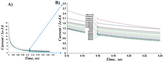 Chronoamperometric responses for PA-PPE-GOX toward different concentrations of glucose (30 µM to 50 mM). Section of (A) is zoomed in as (B).