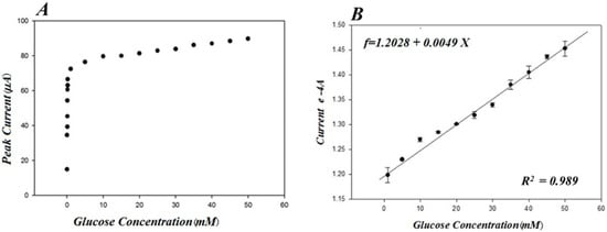 The electrocatalytic performance of PA-PPE-GOX was further characterized by conducting chronoamperometry experiments for the reduction of different concentrations of glucose in 0.01 M PBS (pH 7.4), ranging from 30 μM to 50 mM. Figure 7 depicts the CA responses of glucose reduction at different concentrations of glucose at −0.55 V. The negative operating potential for the detection of glucose eliminates the interference from other common electroactive species, such as ascorbic acid, uric acid, and dopamine, that can be present in real blood samples, which is another advantage of our direct electron transfer glucose biosensor. As the concentration of glucose increased, there was a shift from the linearity between the concentration and current (Figure 8A), exhibiting typical Michaelis-Menten kinetics [58,59]. The Lineweaver–Burk plot [57], a double reciprocal graphical representation of the enzyme kinetics, shows a linear curve graphic based on the following equation: