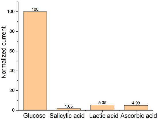 There are substances in the blood that are considered to be interfering species and can interfere with glucose readings in biosensors. We conducted specificity tests using the amperometric i-t technique to validate the specificity of the biosensor PA-PPE-GOX on glucose, as well as ascorbic acid (AA), salicylic acid (SA), and lactic acid (LA) as interfering species. The concentrations of the interfering species were adjusted to a similar concentration as glucose (0.1 M). The amperometric readings are shown in Figure 9, and the currents of the interfering species were very low. We calculated the current ratios between glucose and the interfering species, which were 1.65%, 5.35%, and 4.99% for SA, LA, and AA, respectively. The current ratios between glucose and the interfering species allowed us to infer that our sensor shows great specificity for glucose. The current values of the interfering species represent a higher concentration (0.1 M) than the concentrations that these species can obtain in blood. Therefore, we observed a minimum current response of the interfering species with respect to glucose, indicating high selectivity of the biosensor toward glucose.