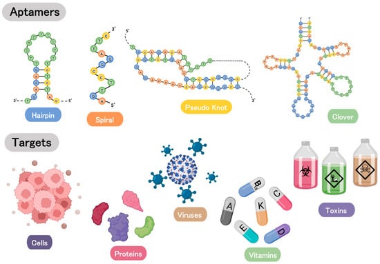 The structures and targets of aptamers. Created with BioRender.com (accessed on 13 March 2023).