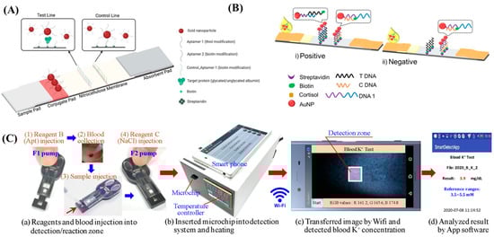 Examples of paper-based POC aptasensors: (A) Sandwich LFA using streptavidin-biotin immobilization for simultaneous capturing albumin and glycated albumin on test line [55]; (B) Working principle of cortisol LFA with an adsorption–desorption sensing mechanism, where either (i) cortisol capture is detected via AuNPs-linker hybridization on the test line (positive result), or (ii) no cortisol is captured on the test line (negative result) [53]; (C) operations steps of paper-based microfluidic integrated blood potassium concentration detection device [58].