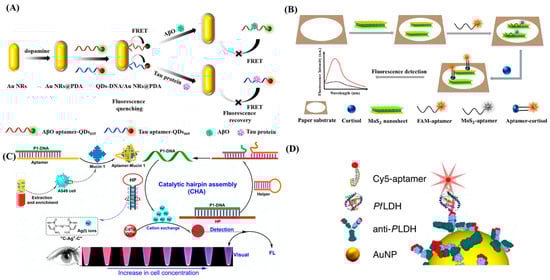 Recently, steroid hormones have been observed to quench fluorescence signals of QDs by means of surface adsorption, which was utilized to develop a selective cortisol (a biomarker for numerous diseases including Cushing’s syndrome and stress disorders) monitoring assay in saliva [65]. QDs that had been functionalized with MNPs were modified with cortisol-specific aptamers for fluorescence quenching. The assay exhibited an LOD down to 1 nM within a 20 min turnaround time. FRET was used for simultaneous detection of the Alzheimer biomarkers Aβ and tau protein with polydopamine-capped gold nanorods (AuNRs@PDA) and dual-color CdSe/CdS/ZnS QDs [66]. Aptamer-target binding caused conformational changes and selective fluorescence recovery under single wavelength excitation (Figure 4A). The aptasensor had LOD values of 50 pM for Aβ and 10 pM for tau, providing a simple and effective Alzheimer diagnosis platform compared to ELISA. A wearable and paper-based FRET aptasensor was developed for monitoring cortisol concentrations [70]. MoS2 nanosheets on carboxyfluorescein-modified aptamers formed the FRET mechanism. The hybrid 3D origami microfluidic device integrated with a custom build smartphone-mounted detector was used to monitor fluorescence recovery (Figure 4B). The presence of cortisol in the perspired sweat intervened with the FRET mechanism by conformationally changing the aptamer structure. The fluorescence intensity was recovered proportionally to the captured amount of cortisol, and the LOD was 6.76 ng·mL−1 in artificial sweat.