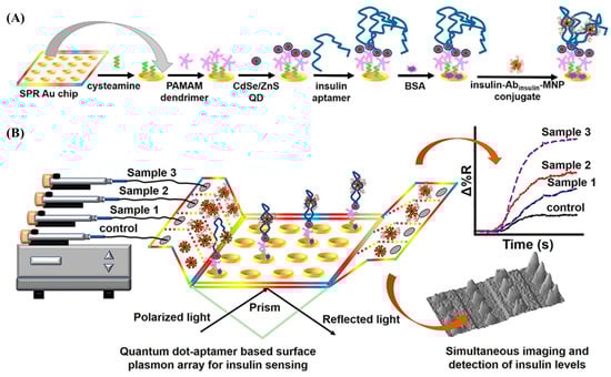 SPR microarray aptasensor design for serum insulin detection. (A) The schematic for the aptamer-functionalized QD-based sensor. (B) Difference image and respective sensograms of serum insulin-Abinsulin-MNP conjugates binding on the immobilized aptamer microarray [92].