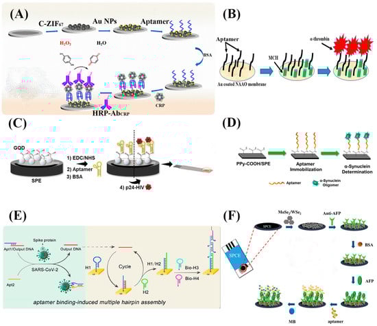 Avidin or streptavidin are tetrameric proteins with an affinity for biotin that have been reported to be used to immobilize biotin-labeled aptamers. The streptavidin–biotin immobilization was used to develop a dual-aptamer POC electrochemical aptasensor with an enhanced signal response for detecting SARS-CoV-2, the causative agent of COVID-19. Two aptamers bound the SARS-CoV-2 target in a sandwich assay for proximity binding, increasing the local concentrations of DNA strands. This increased concentration resulted in the displacement of DNA, converting the SARS-CoV-2 to output DNA that induced a chain reaction of hybridization, creating long and linear concatemers with multiple hairpin assemblies. These multiple hairpin assemblies were labeled with biotin, and immobilized a substantially large amount of streptavidin–alkaline phosphatase (ST–ALP). This large quantity of ALP could generate an enhanced signal reaction when reacting with 1-naphthol phosphate (1-NPP) through an electrochemical oxidation reaction (Figure 8E). The sensor exhibited a linear range from 50 fg·mL−1 to 50 ng·mL−1 and a detection limit of 9.79 fg·mL−1 [84]. Two-dimensional (2D) materials have been reported to improve the electrode reactivity and chemical loading quantity on the electrode of biosensors due to their electrochemical properties and high active surface area [206]. Hence, an electrochemical aptasensor was developed by modifying a screen-printed carbon electrode with 2D MoSe2/WSe2 to detect a biomarker for primary liver cancer named prime alpha-fetoprotein (AFP); this was able to achieve a detection limit of 0.65 pg·mL−1 (Figure 8F) [85]. Moreover, the addition of nanomaterials, such as AuNPs, has also been attempted, and caused an improvement in the signal response; as a result, the detection limit decreased from 24 pg·mL−1 to 2.4 pg·mL−1 [207].