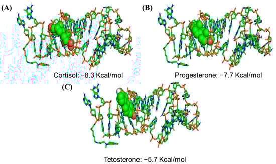Molecular Docking results of the interaction of aptamer and (A) cortisol, (B) progesterone, and (C) testosterone [230].