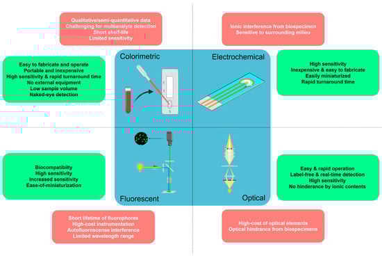 The growing number of discoveries on the chemical pathways taken by diseases have driven our recent advancements in medicine and biomedical technologies [1,2,3]. Tracking biomarkers in our bodies provides us with plentiful information about a number of health conditions, such as an indication of specific physiological conditions, the presence of a disease, the progress of treatment, and the risk of disease development. The presence of certain biomarkers can be recognized as a conformation of diseases, such as cancer [4], cardiovascular diseases [5], neurodegenerative diseases [6], viral infections [7], and organ injuries [8]. Therefore, the application of in vitro biomarker detection has been expanded to many diseases; accordingly, the necessity of rapid and cost-effective solutions has increased in our search for the early diagnosis of life-threatening diseases.