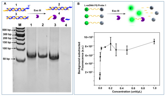 Traditionally, exonuclease III (Exo III) is used as a dsDNA-specific exonuclease that can catalyze the stepwise removal of mononucleotides from 3′-hydroxyl termini of dsDNA [1]. It favorably cleaves 3′ termini of linear dsDNA (L-dsDNA) with 5′ overhangs or blunt ends and 3′ overhangs containing fewer than four bases [2,3]. Exonuclease III can degrade from a nick on a circular dsDNA in the 3′ to 5′ direction, producing single-stranded circular DNA [4]. Exo III is a distributive enzyme that frequently dissociates during digestion [5]. However, dsDNA with 4-base or longer 3′-protruding termini was resistant to Exo III degradation in earlier reports [6]. Many reports have asserted that Exo III will not degrade ssDNA [7,8]. Inspired by this unique feature, Exo III has been widely used for target recycling amplification (TRA) [9,10,11,12]. Target DNA with protruding 3′-termini can form a hybrid with a single-stranded DNA probe, which can be selectively digested to generate a signal and release the target DNA to re-hybridize with another probe to initiate the subsequent cycling cleavage process.