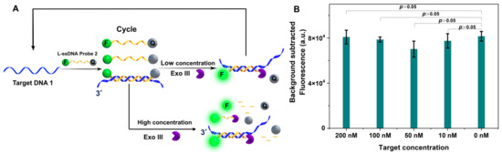 To resolve this puzzle, we explored the ssDNA cleavage activity of two types of Exo III-assisted TRA with an L-ssDNA probe free in the reaction buffer or fixed on a solid surface. First, target DNA1 could hybridize with the L-ssDNA FQ probe 3 (sequence in Table S1) in solution (Figure 3A). The L-ssDNA FQ probe with recessed 3′-termini in dsDNA could be selectively digested by Exo III to generate a fluorescence signal. In our assay, different concentrations of target DNA were used (200 nM, 100 nM, 10 nM, and 1 nM) in the Exo III (0.3 unit/μL)-assisted TCA. However, the fluorescence intensity was not discernibly different with or without target DNA (Figure 3B). PAGE (Figure S1 in Supplementary Materials) was used to further confirm the fluorescence study results. The data indicated that a high concentration of Exo III could cleave both target DNA1 and L-ssDNA probe 2.