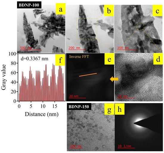 TEM images of BDNP-100 and BDNP-150 are displayed in Figure 1. The samples’ size, morphology, and crystallinity are different. BDNP-100 comprises several small nanosheets overlaid on a few large carbon sheets. HRTEM data reveal the crystalline nature of BDNP-100. As the inverse FFT image shows, the interlayer spacing across the orange line was calculated as 0.3367 nm, close to the 002 planes of graphitic carbon. In addition, other interlayer distances of 0.21 nm and 0.26 nm were also found in the HRTEM images of BDNP-100, which is attributed to the 100 planes of graphite. In contrast, no crystallinity was observed for the BDNP-150 sample, possibly due to the destruction of the crystalline texture at higher hydrothermal temperatures [44]. The particles in BDNP-150 are semispherical, with an average diameter of 19.7 nm.