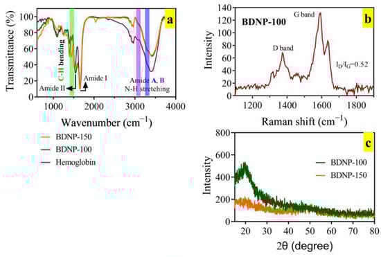 (a) FTIR, (b) Raman and (c) XRD patterns of BDNP samples. In panel a, the FTIR spectrum of hemoglobin is presented for comparison.
