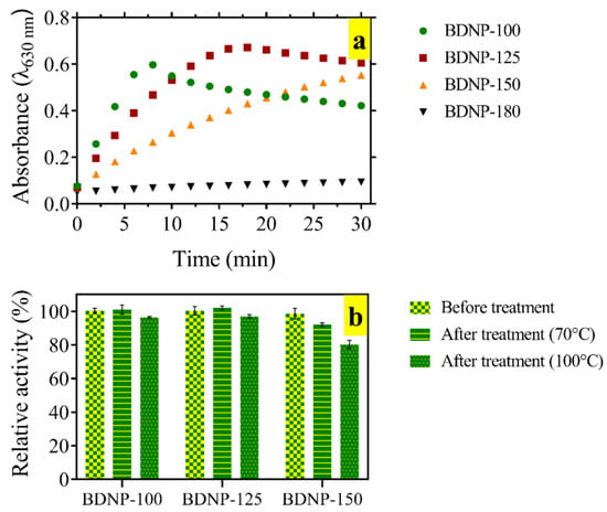 As BDNP-180 did not show any colorimetric signal, they were excluded from the catalytic activity evaluation. The catalytic stability of the BDNP samples in harsh thermal conditions was studied. To this end, the samples were subjected to heating at 70 °C and 100 °C (Figure 3b). After cooling them down to room temperature, the catalytic activity was compared to the untreated samples (control). We observed that BDNP-100 and BDNP-125 retained their activity to almost 100% after heating to 70 °C and lost only 3–4% of their activity after heating to 100 °C. On the other hand, BDNP-150 lost its catalytic activity by 8% and 17% after treatment at 70 °C and 100 °C, respectively.