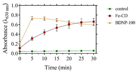We also compared the peroxidase mimetic activity of BDNP-100 to the Fe-doped nanozymes prepared by citric acid as the carbon source and FeCl2.4H2O as the dopant (Fe-CDs) [40]. Over the same concentration of catalysts, we found that BDNPs exhibit higher peroxidase mimetic activity, as shown in Figure 4. We measured the concentration of the iron atoms in the samples using ICP and achieved a Fe(BDNPs)/Fe(Fe-CD) ratio of 0.148. Despite the low amount of iron in BDNP-100 compared to the Fe-CDs, the catalytic activity of the former was considerably higher. We propose that the chemical microenvironment around the metal ion in BDNP-100 is structurally closer to the microenvironment of Hb (as the precursor) than that of Fe-CD, which is synthesized using citric acid and FeCl2 as precursors. The inferior catalytic activity of Fe-CD than BDNP-100 is demonstrated by comparing their kinetic parameters, as will be discussed in Section 3.3. The Vmax toward H2O2 reduction was lower in Fe-CD compared to the BDNP or Hb samples, which agrees well with the lower catalytic activity of Fe-CDs in Figure 4. The Km value of Fe-CD for H2O2 was lower than BDNP-100 and BDNP-150, demonstrating a higher affinity of Fe-CD than BDNPs toward H2O2.