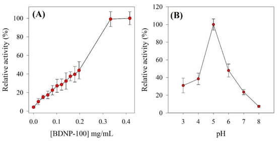 In light of the higher efficiency of BDNP-100 than BDNP-150 toward H2O2 reduction, optimization experiments proceeded using the former catalyst. The effect of BDNP’s concentration and pH on the progression of the catalytic reduction of H2O2 was investigated. In each case, relative activity was measured, which is defined as the ratio of the oxidized TMB absorbance in the presence of H2O2+BDNP to the absorbance in the presence of H2O2 alone. Figure 5A shows that a higher amount of BDNP in the reaction mixture resulted in higher relative activity until a plateau was reached over the concentration range of 0.3–0.4 mg mL−1. Figure 5B illustrates that the highest relative activity of BDNP-100 was observed at pH 5. A decrease in the activity at alkaline pHs is possibly due to the instability of H2O2 at high pH values.