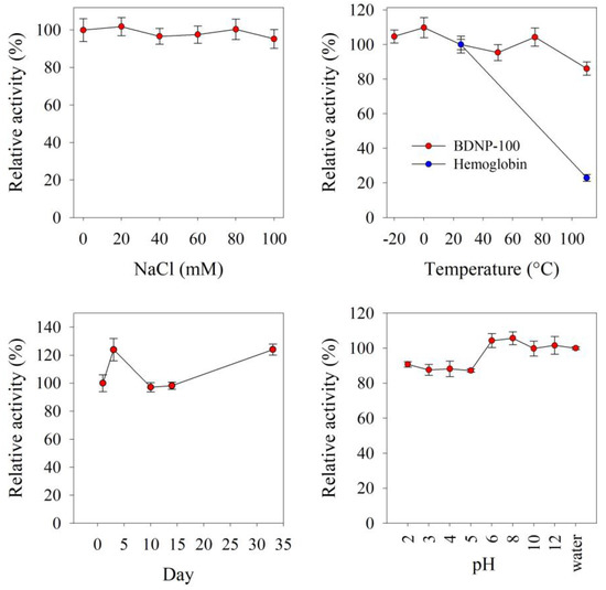The effects of storage conditions, including NaCl concentration (20–100 mM), pH (2.0–12.0), temperature (−20–110 °C), and time (33 days) on the relative activity of BDNP-100.