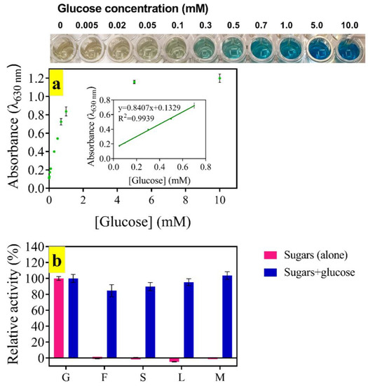 (a) Calibration plot of glucose; (b) selectivity of the colorimetric assay toward different sugars presented in the sample individually (red bars) and co-existed with glucose (gray bars). G: glucose, F: fructose, S: sucrose, L: lactose, M: maltose.