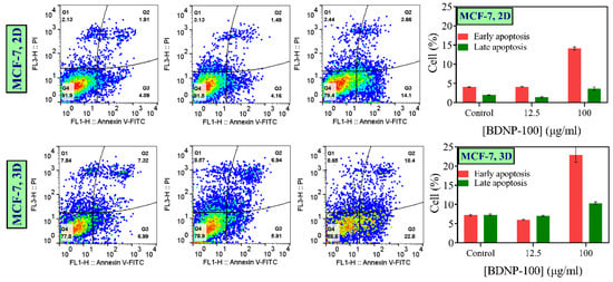 The ability of BDNP-100 to induce apoptosis was determined by the Annexin IV-PI assay (Figure 11). The effect of low (12.5 µg/mL) and high (100 µg/mL) concentrations of BDNP-100 on the apoptosis of MCF-7 cells in the forms of monolayer and 3D spheroids was studied. The results showed that the population of cells in their early or late apoptotic stages was higher in spheroids than in monolayer cells due to the hypoxic condition of tumor-like spheroids and a lack of nutrition compounds in the spheroids’ cores. Furthermore, regardless of the culture type, the percentages of the early apoptotic cells associated with the control and the samples treated with a low concentration of BDNP-100 were very close, showing that 12.5 µg/mL of BDNP-100 induced a negligible toxic effect. In contrast, the number of early and late apoptotic cells was enhanced by increasing the concentration of BDNP-100 to 100 µg/mL. However, the rate of change in early apoptosis was much higher than the one observed for late apoptosis.