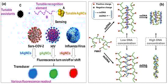 (a) Schematic illustration of the working mechanism of CP-biosensors in detection of various viruses based on different fluorescent readouts. Different types of CPs indicate blue, green, and red fluorescents, respectively. The various readouts (filled with blue, green, and red colors) indicate the sensing signals are obtained from different fluorescent CPs [59]; (b) Proposed scheme representing the binding mechanism between PMNT and ssDNA/dsDNA [61].