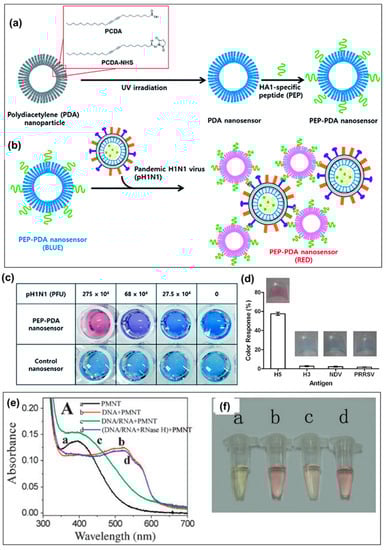 (a,b) Schematic illustration of the peptide-functionalized polydiacetylene (PEP-PDA) colorimetric biosensor for pH1N1 detection; (c) Colorimetric response of the PEP-PDA biosensor to different concentrations of pH1N1 [80]; (d) Colorimetric response of the PDA vesicle-based biosensor to different pathogens: H5—H5N1 influenza virus, H3—H3N2 influenza virus strain, NDV—Newcastle disease virus LaSota strain, and PRRSV—porcine reproductive and respiratory syndrome virus VR2332 strain [86]. (e) UV–vis absorption spectra and (f) optical images of PMNT with various target molecules: (a) pristine PMNT; (b) DNA; (c) DNA/miRNA; and (d) DNA/miRNA + RNase H [94].