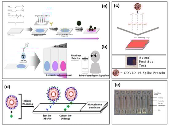 (a) Preparation process of PDA-paper chips and (b) the POCT system integrating PDA-paper chips for colorimetric detection of pH1N1 virus [103]; (c) PDA-paper biosensor for detection of the SARS-CoV-2 spike protein in artificial saliva [104]; (d) schematic illustration of preparation approach PDA nanovesicle-based colorimetric biosensor on nitrocellulose membrane and (e) its commercial kits [91].