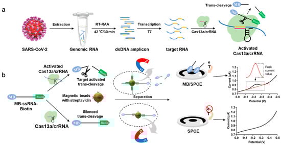 Figure 1. Principle of the electrochemical Clustered Regularly Interspaced Short Palindromic Repeats (CRISPR) biosensor for detecting severe acute respiratory syndrome coronavirus 2 (SARS-CoV-2) RNA. (a) SARS-CoV-2 RNA is extracted from a sample, reverse transcription recombinase-aided amplification (RT-RAA)-amplified, T7 transcribed, and then subjected to the LwaCas13a (Cas13a) trans-cleavage reaction. The Cas13a-crRNA duplex binds target SARS-CoV-2 RNA (140 nt), which activates the trans-cleavage activity. The reRNA, modified with biotin and methylene blue (MB), is then cleaved, and the unbound MB-oligonucleotide is used in the electrochemical measurement. (b) The main process of the electrochemical CRISPR biosensor. When the target RNA is present, the function of Cas13a-crRNA is activated, and the reRNA is cleaved into MB-oligonucleotide and biotin-oligonucleotide. The extra uncleaved reRNA and biotin-oligonucleotide are removed by SA-coated magnetic beads, leaving the MB-oligonucleotide in the solution, which could be detected by electrochemical measurement. When the target RNA is absent, the function of Cas13a-crRNA is not activated. No cleavage of reRNA occurs in the solution, and the reRNA is removed by streptavidin (SA)-coated magnetic beads. Therefore, almost no electrochemical signal can be observed.