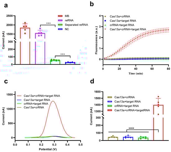To further examine the feasibility of the biosensor for nucleic acid detection, we selected the N gene of SARS-CoV-2 as the target RNA. Cas13a trans-cleavage activity was activated in the presence of target RNA, and the cleavage of reRNA could be monitored by real-time fluorescence monitoring (Figure 2b) and electrochemical measurements (Figure 2c,d) by reading a significant fluorescence signal or electrochemical peak. The fluorescence and electrochemical signals barely changed in the absence of Cas13a, crRNA, or 10,000 pM target RNA (Figure 2b–d). The amplitude of the electrochemical peak reflected the degree of reRNA cleavage. The average electrochemical peak current of the Cas13a + crRNA + target RNA group reached 1398.0 nA after CRISPR/Cas13a trans-cleavage activity, which is 30-fold higher than the average peak current of the Cas13a + crRNA group (46.1 nA), indicating excellent feasibility for this detection platform (Figure 2d).