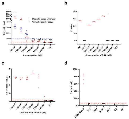 Figure 4. Performance evaluation of the electrochemical CRISPR biosensor with RT-RAA amplification. Sensitivity analysis of (a) the electrochemical CRISPR biosensor with (filled dots) or without (hollow dots) SA-coated magnetic beads enhancement, (b) the RT-QPCR assay, and (c) the fluorescent CRISPR assay were performed with various concentrations of target RNA from 0.166 aM to 1.66 × 104 aM. (d) Specificity analysis with 1.66 × 104 aM RNA of SARS-CoV-2, human immunodeficiency virus (HIV), hepatitis B virus (HBV), hemagglutinin 1 neuraminidase 1 (H1N1), dengue virus (DENV), and Coxiella burnetii (CB). The red horizontal dashed line indicates the cutoff current value of the electrochemical CRISPR biosensor with magnetic beads enhanced (a,d) and the fluorescent CRISPR assay (c). The blue horizontal dashed line (a) indicates the cutoff current value of the electrochemical CRISPR biosensor without magnetic beads enhanced. The red-filled dots (ad) and hollow blue dots (a) indicate positive results, and the solid black dots (ad) and black hollow dots (a) indicate negative results in the electrochemical CRISPR biosensor with magnetic beads enhanced assay, electrochemical CRISPR biosensor without SA-coated magnetic beads enhancement, the RT-QPCR assay and the fluorescent CRISPR assay.