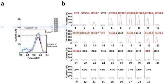 Figure 5. Analysis of clinical samples. (a) Electrochemical CRISPR biosensor with RT-RAA amplification test results of seven clinical samples from healthy individuals, NC1 through NC7, are the clinical samples from healthy individuals. (b) Thirty-nine suspected positive clinical samples were also tested using the electrochemical CRISPR biosensor with RT-RAA amplification and real-time fluorescence RT-qPCR (Ct value on each small panel, red and black Ct value represent the sample was judged as positive or negative by the electrochemical CRISPR biosensor with RT-RAA amplification). Sample numbers 1–39 successively represent 39 clinical sample numbers. The horizontal dashed line indicates the threshold (value is 55nA). The curve is the SWV signal of the electrochemical CRISPR biosensor test results. The red curve indicates that the maximum current value exceeds the threshold and is judged as positive. Conversely, the black curve indicates that its maximum current value is less than the threshold value, and the result is judged negative.