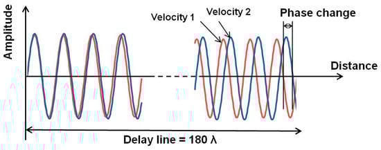 On the other hand, the calculated SH-SAW velocity change on the gold film in the air between 117.5 nm and 116.5 nm thickness is 1066 ppm. This means that the mass loading sensitivity of the SH-SAW delay line sensor is 1066 ppm per 1 nm gold film thickness change in the air. Since the sensing length of this delay line sensor chip is 3.6 mm, a 1 nm change in gold film thickness produces a phase shift of 72.6 degrees in the air. If the minimum phase resolution of this system is 0.1 degrees, then the minimum resolution of the gold film thickness change would be 0.0138 nm in the air.