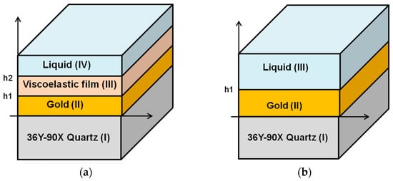 To understand the performance of the SH-SAW sensors, numerical computational analysis of the SH-SAW has been investigated [31,33,35]. The model structures are shown in Figure 3a,b. There are multiple layers: substrate (I)/metal(II)/liquid(III) or substrate (I)/metal(II)/viscoelastic film(III)/liquid(IV). In Figure 3a, the substrate layer (I) is 36Y-90X quartz, the metal layer (II) is gold, the additional material layer (III) is a protein layer, and the liquid layer (IV) is water or a buffer [31,33]. In this review, a three-layer model as shown in Figure 3b was used to calculate the glycerol-water mixture. The substrate layer (I) is 36Y-90X quartz, the metal layer (II) is gold, and the liquid layer (III) is a glycerol-water mixture [35,36]. In these calculations, we used an improved numerical computational method for these model structures [31,34,36]. This method was modified from two computational methods: one is based on Campbell and Jones [37], and the other is based on Moriizumi, Unno and Shiokawa [38]. This calculation method has been reported in detail [39]. In the calculation of glycerol-water mixtures, the density and viscosity of the liquid were used for layer (III). Since the solution was approximated as an uncompressed isotopic medium, the shear modulus of elasticity can be defined by the viscosity [39]. The material constants for different concentrations of glycerol mixtures were obtained from the technical data handbook [40]. We used the following values in our calculations, as shown in Table 1. This numerical calculation method [31,34,36] is very adequate for SH-SAW sensor devices on quartz. On the other hand, another analytical model for SH-SAW devices using FEM (Finite Element Method) will be investigated in the near future.