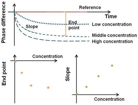 To compare changes in the SH-SAW, the phase shift is analyzed using an endpoint window, which is the signal difference from the phase shift at the initial baseline point to the phase shift at a specific time point. However, endpoint data are more susceptible to spurious initial points and are usually saturated at high concentrations. Another way to analyze real-time data is to use the slope of the real-time curve for a specific range. The advantage of a slope window is that we can quickly get a result in a few seconds. By using a slope window of 20–40 s, a measurement such as a SAW biosensor with an S-protein coating can be completed in less than 40 s. By creating a standard curve using the slope of a specific range of real-time curves, a fast test can be completed in less than a minute [30,50].