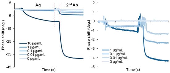 The limit of quantification (LoQ), limit of blank (LoB) and limit of detection (LoD) are parameters to confirm the sensitivity of the biosensor by performing 60 replicate tests at low concentrations to check the standard deviation and coefficient of variation [52]. SH-SAW measurements using secondary antibodies, such as the CRP SAW biosensor, can achieve an LoQ of 1 μg/mL, while direct SH-SAW measurements, such as the Lp(a) SAW biosensor, can achieve an LoD of 83 μg/mL. Direct measurements on the S protein-coated SAW biosensor were determined to have an LoD of 41.91 BAU/mL for the whole blood sample [42]. This SH-SAW biosensor system can directly accept a drop of whole blood on the sensor surface and measure the concentration of the target protein in the sample without any additional washing process. Unlike the SH-SAW biosensor, electrochemical-based measurements or other detection methods can achieve better sensitivity through multiple washing steps or complex processes before and after the measurement, as shown in Table 5. Since whole blood contains red cells, white cells, and many different proteins, unfortunately, these interferences may lead to some errors in the measurements. Nevertheless, this SH-SAW biosensor system can provide results in this harsh environment. The absence of a pretreatment and cleaning system is a clear advantage of this SH-SAW biosensor system and must be highly expected in POCT applications. On the other hand, if we use this SH-SAW biosensor system in a buffer, a very clear signal will be obtained and then the detection limit will be improved. Figure 6 shows some experimental results of CRP detection in a buffer. The figure shows the direct detection method with antigens bound to a capture antibody on the surface and sandwich detection of secondary antibodies binding to a capture antibody bound to the antigens. In this case, the signal at 0.01 μg/mL is easily distinguishable from the signal at 0 μg/mL, and the LoD will be smaller than 0.01 μg/mL. There are also some opportunities to enhance the output signals using gold nano-particles [51,53], horseradish peroxidase (HRP) [54], and gold staining [55]. The detection limit can also be improved by reducing the nonspecific binding. Not only can the blocking agent help prevent nonspecific binding, but some studies have also integrated a transducer into the current biosensor to induce an extra surface shear to remove weakly nonspecifically bound molecules from the sensing surface [56]. Since SAW devices are sensitive to environmental conditions, adjustment or compensation for temperature can also help to improve the sensitivity of the SAW biosensor [57]. In general, acoustic wave-based sensor devices have temperature characteristics that may cause some measurement errors due to the temperature. In the actual testing environment for POCT, attention should be paid to the temperatures of the sensor chips and/or the sample solutions, as they will be outside the laboratory. For this reason, we use a quartz-based SH-SAW sensor, which has a lower temperature drift than LiTaO3 or LiNbO3-based devices. In addition, in our SH-SAW sensor system, the reference channel helps to compensate for errors due to temperature drifts [58].