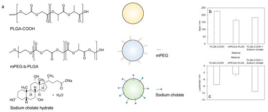 Figure 2. Nanoparticle preparation: (a) chemical formulas of reagents (poly(D,L-lactide-co-glycolide carboxyl-terminated, PLGA-COOH, methoxy poly(ethylenglycol)-block-poly(D,L-lactide-co-glycolide, MPEG-b-PLGA, sodium cholate hydrate as surfactant) and corresponding schematization of the formed nanoparticles; (b) size and (c) surface ζ-potential, measured in samples containing freshly prepared nanoparticles.