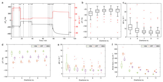 The final values of ΔF measured for the adlayer formation (Figure 3b), calculated as the difference between the frequency value measured after rinsing and the baseline, ranged from −30 Hz to −55 Hz for all the considered overtones. The values of ΔD were less than 12 × 10−6 for all the overtones considered (Figure 3c). The final values of ΔF and ΔD measured for the probes were also not significantly dependent on the overtone number. The final ΔFs measured after the rinsing were larger for the HPF, smaller for the HSA, and median for the HBG (Figure 3d). The values of ΔD were in the range of 3 × 10−6 to 5 × 10−6 (Figure 3e). These values were reasonably closer to the limiting value for the application of the Sauerbrey equation, and this allowed us to calculate the areal mass using this model. The areal masses were strongly dependent on the overtone and ranged from 50 ng cm−2 to 500 ng cm−2 (Figure 3f).