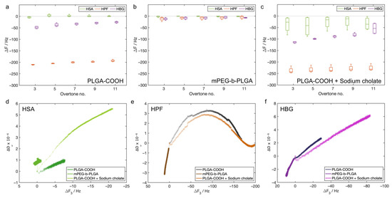 The sample detections (Figure 4a–c) indicated that the HSA probe had a poor interaction with all the analyzed samples. A larger ΔF was measured only for the sample PLGA-COOH + sodium cholate with this protein. The signals measured with the HPF probe were very large for both PLGA-COOH-based samples, in particular in the sample containing the surfactant. On the other hand, the mPEG-b-PLGA sample gave a very low signal (in the range of −3 Hz to −8 Hz). The HBG probe provided intermediate values with respect to the HSA and HPF. Such signals were significant for PLGA-COOH and PLGA-COOH + sodium cholate, while the ΔF was low for mPEG-b-PLGA (in the range of −9 Hz to −12 Hz).