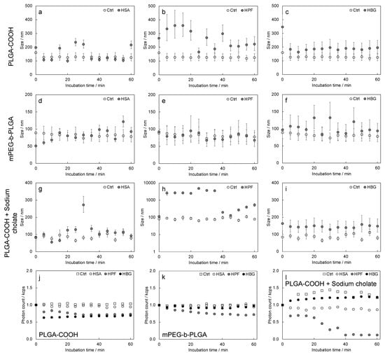 Figure 5. DLS analysis: mean size values measured vs. time for (ac) PLGA-COOH; (df) mPEG-b-PLGA; and (gI) PLGA-COOH + sodium cholate, respectively; (jl) photon count rates.