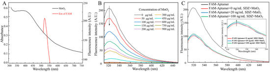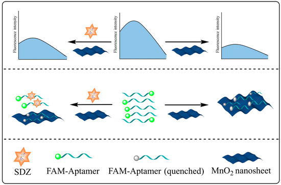 Aptamer development as a new type of recognition probe provides new ideas for the development of its detection. Aptamers are single-stranded DNA (ssDNA) or RNA that specifically bind to target molecules. Aptamers have superior stability, excellent affinity, strong specificity, and easy in vitro screening compared to antibodies [12,13,14]. With these advantages, various aptamer-based sensors have been widely developed for environmental monitoring and food safety inspection (e.g., fluorescent, electrochemical, surface-enhanced Raman scattering, and photoelectrochemical sensing signals) [15,16,17]. In comparison, fluorescent aptasensors have been widely used in the field of detection for their ability of sensitivity, low cost, and selectivity, which make them particularly useful in monitoring food and environmental samples [18,19], and fluorescent aptamer sensors based on nanomaterials (quantum dots, graphene oxide, nanosilicon, etc.) have attracted considerable attraction [20,21,22]. In particular, manganese dioxide (MnO2) has attracted much attention for its low cost, strong molar extinction coefficient, environmental tolerance, and non-toxicity, which has been widely used in biomedical and biosensing fields [22,23]. As a constantly developing two-dimensional nanomaterial, MnO2 nanosheets are easy to prepare on a large scale and possess broad absorption peaks that can overlap with the emission spectra of many fluorescent materials, making them considered to be quencher candidates. In addition, because MnO2 has a large specific surface area and good biocompatibility, it can greatly improve the detection of targets. Xu et al. reported that MnO2 nanosheets adsorb ssDNA through van der Waals forces interacting with bases, thus exhibiting strong absorption and efficiency of fluorescence burst [24]. Consequently, Qin et al. established an upconversion MnO2-based biosensor for the detection of carbendazim pesticides in food [25]. Li et al. constructed an open fluorescence sensor based on carbon dot-labeled oligodeoxyribonucleotide and MnO2 nanosheets for the detection of mercury(II) [26]. However, MnO2-based fluorescent aptasensors for the detection of SDZ residues have not been reported so far.