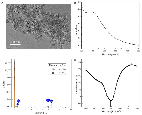 (A) TEM images of MnO2. (B) The UV−Vis of MnO2. (C) EDS elemental mapping of MnO2. (D) The FTIR of MnO2.