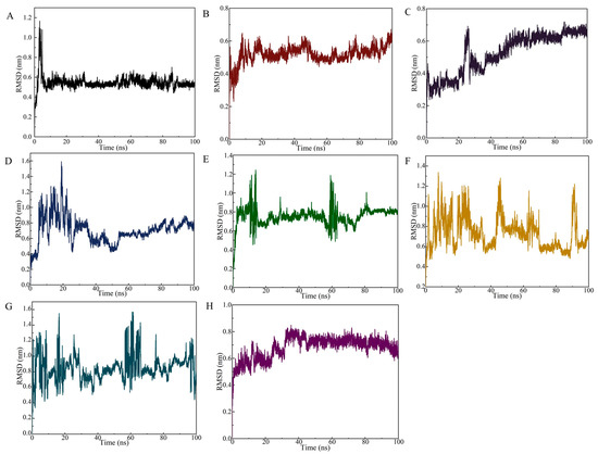 RMSD of the SDZ30-1 aptamer against SDZ and other antibiotics. (A) SDZ; (B) SMZ; (C) SQX; (D) tetracycline; (E) norfloxacin; (F) chlortetracycline; (G) nitrofurazone; (H) furaltadone.