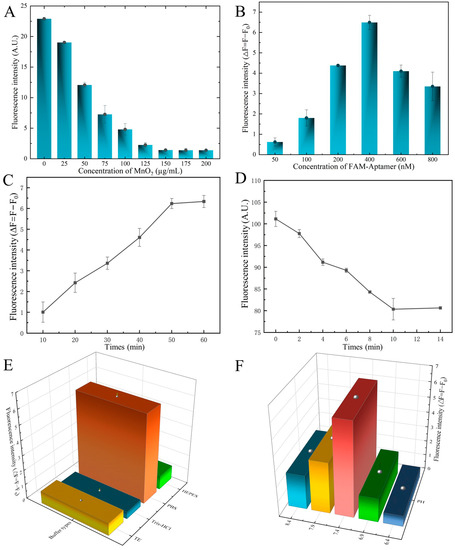 Moreover, we found that as the concentration between FAM-SDZ30-1, MnO2, and SDZ was optimized, the higher the concentration of MnO2; the lower the fluorescence intensity of the system, when the concentration reached 150 µg/mL, the fluorescence intensity stabilized, and thus, 150 µg/mL was chosen as the best MnO2 concentration (Figure 5A). When the concentration of aptamer was 400 nM, the fluorescence value of the system was the highest, and therefore 400 nM was taken as the optimal concentration of the aptamer (Figure 5B). The fluorescence intensity of the aptamer and SDZ reached stability as the time up to 50 min (Figure 5C), thus 50 min was the best incubation time. The fluorescence intensity decreased gradually with the increase of time, and the fluorescence stabilized when the time arrived at 10 min, thereby selected as the best quenching time (Figure 5D). The highest fluorescence intensity of this system was also observed in the PBS buffer (Figure 5E). The pH value affected the fluorescence intensity of the fluorescent aptasensor, and 7.4 was the best pH condition (Figure 5F).