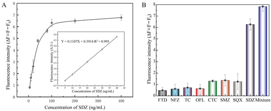 Briefly, 40 μL of FAM-labeled aptamer (2 μM) was mixed with SDZ at various concentrations (5, 10, 20, 40, 80, 100, 200, and 400 ng/mL) after gentle shaking for 50 min at 25 °C in the dark. After that, 30 μL MnO2 (1 mg/mL) was added, and the mixture was incubated for 10 min and centrifuged at 10,000 rpm for 5 min. The fluorescence intensity of the supernatant was measured and a standard curve was established with different SDZ concentrations. The limit of detection (LOD) was acquired by calculating the 3SD/slope (the slope of the linear curve), and the SD was the standard deviation from the fluorescence values of a blank sample [29].